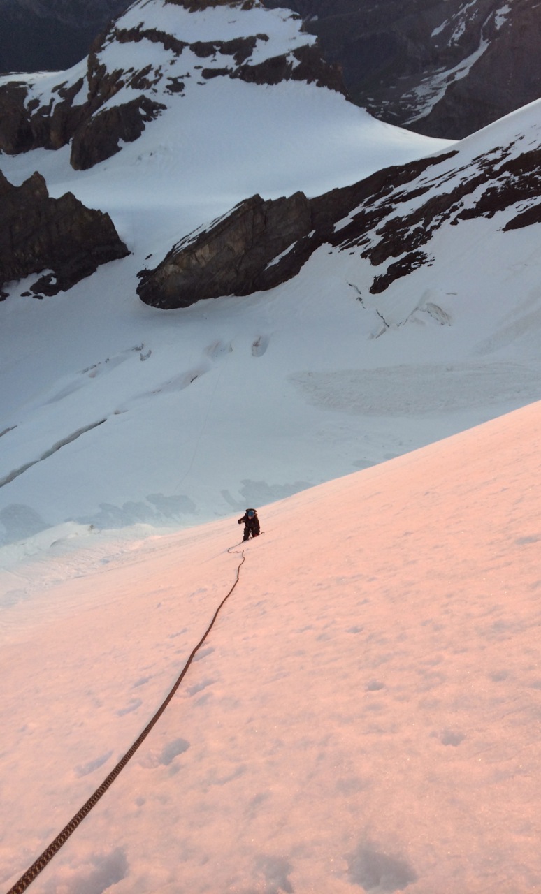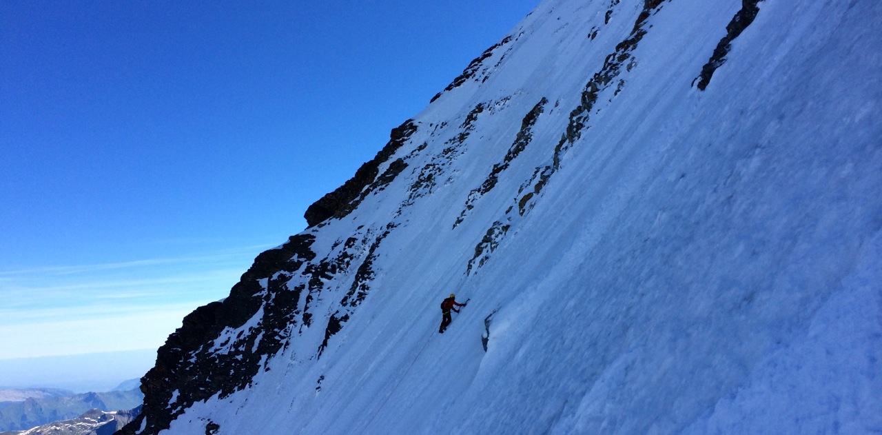 Die Wetterprognose zeigte ein eintägiges Schönwetterfenster im Berner Oberland an – also ab in die Blüemlisalphütte. Von dort nahmen mein Gast und ich die Nordwand mit anschliessender Ueberschreitung in Angriff. Die Verhältnisse in der Wand waren perfekt, so standen wir...