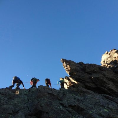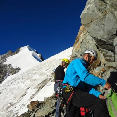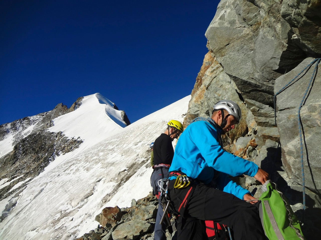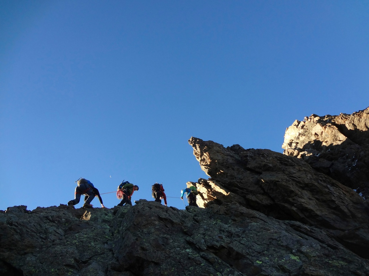 Nach dem Klettertag an der Fiamma gingen wir weiter ins Engadin, genaugenommen nach Pontresina. Von dort nahmen wir die Kutsche in Morteratschtal – und stiegen zur Tschiervahütte auf. Am nächsten Tag stand der Piz Bernina auf dem Programm. Bei besten Verhältnissen konnten wir diesen östlichsten Viertausender via dem Biancograt besteigen. Was für eine Tour -meiner Meinung nach eine der komplettesten Grattouren in den Alpen.