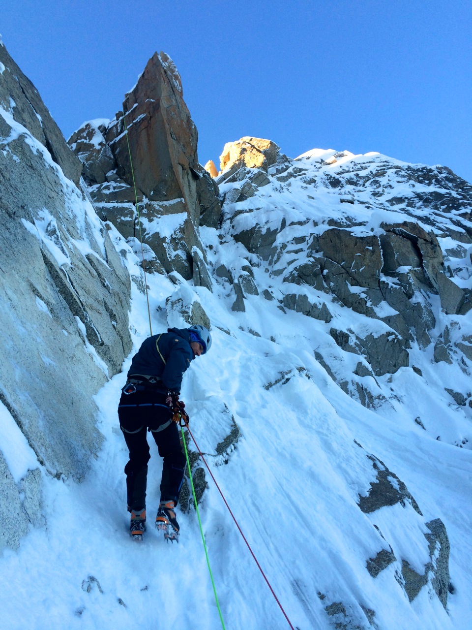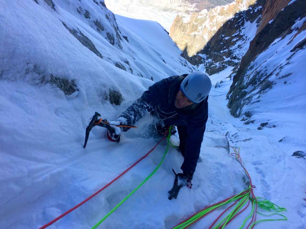 Chamonix!!! Da schlägt das Bergführerherz höher. An diesem Tag im April sind wir zuerst das Bournier Vogler Couloir geklettert und haben dann als Abrundung noch den Comiques Grat angehängt. Den ganzen Tag haben wir nur zwei andere Seilschaften gesehen…beim Alpinismus zahlen sich Flexibilität und Abenteuergeist oft aus…