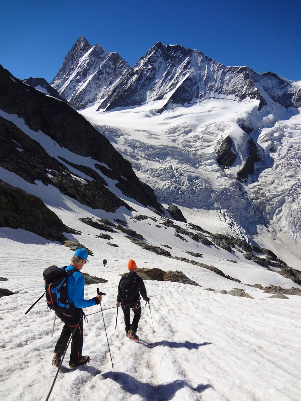 Und wieder zur Schreckhornhütte. Die ersten Tage dieser Tourenwoche wollten meine Gäste gerne in der Region um Grindelwald verbringen. Wie beschlossen ein paar Ausbildungstage in der Schreckhornhütte zu verbringen. Die Wetterprognosen waren bestens und so konnten wir schon am zweiten Tag auf den Gipfel des Strahlegghorns klettern. Der Berg bietet sich geradezu an für eine Ausbildungstour. Es ist im abgelegenen Tal sehr ruhig und landschaftlich wunderschön. Vielen Dank auch an das Hüttenwirtspaar, Rosmarie und Hans Balmer, die Bewirtung war top!