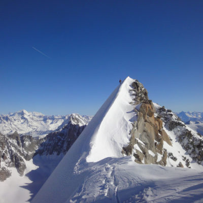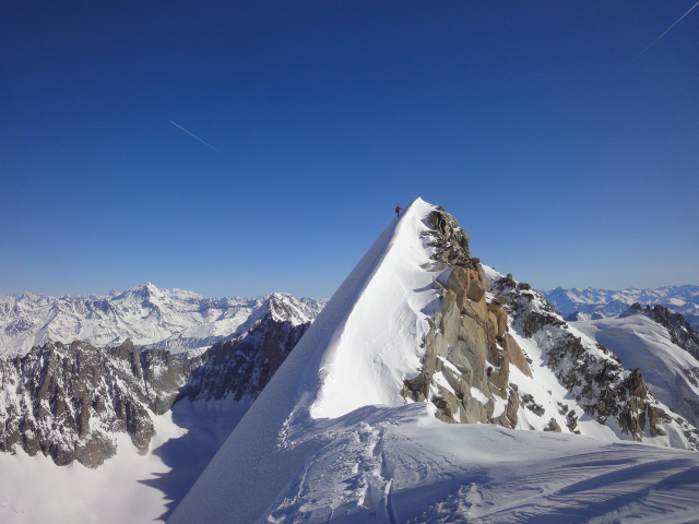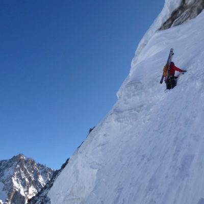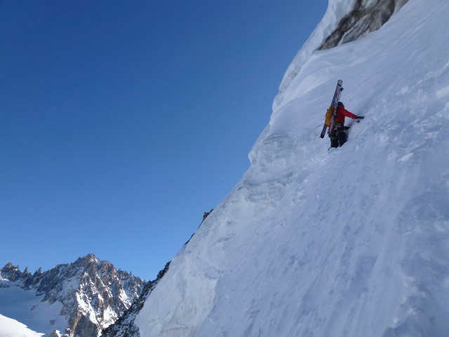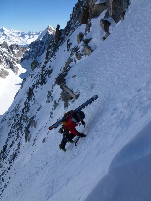 Nach der ‘M6 Solar’ war nun Bergsteigen angesagt. Wir hatten von meinem Freund Andreas Fransson gehört, dass die Verhältnisse an der Courtes gut sein sollten. So packten wir nur leichtes Gepäck und starteten mit der ersten Bahn von Argentière zur Grands Montets. Von da stiegen wir mit den Skis an den Fuss der Courtes. Da niemand über uns in der Wand war, beschlossen wir seilfrei zu klettern. Um 1030 stiegen wir ein und um 1330 standen wir auf dem Gipfel. Die Verhältnisse waren phantastisch. Die Skiabfahrt vom ‘Col de la tour des droites’ war ging auch ganz zügig, sodass wir um 1530 wieder in Chamonix waren. Im Moment hat es noch genügend Schnee, dass man problemlos bis nach Chamonix abfahren kann. Ein genialer Tag, danke Dres!