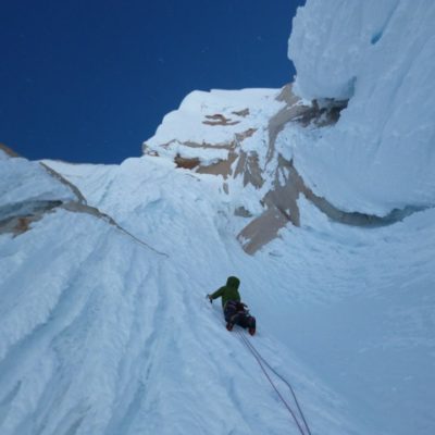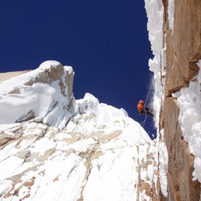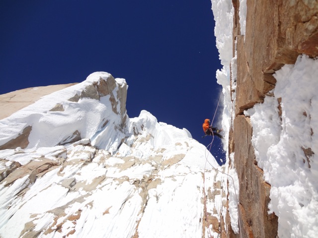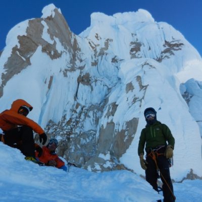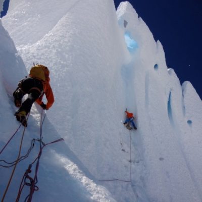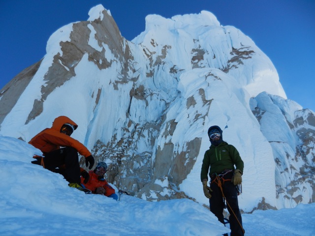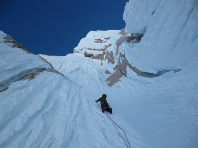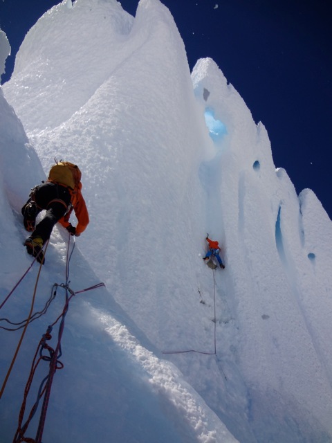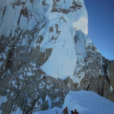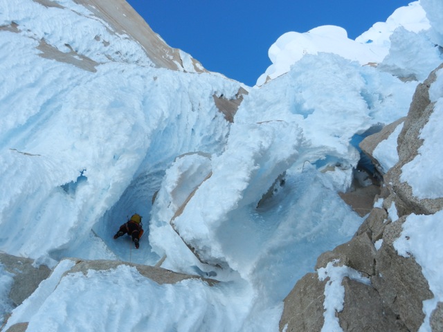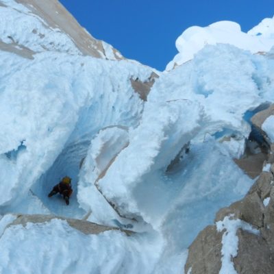 Der Morgen des Gipfeltages begann bestens. Bis zum Helmo war das Eis ziemlich hart, was in die Waden ging. Dort wartete die erste schwerere Seillänge auf uns. Die ‘Wings’ wurden montiert und etwa 30 Minuten später standen wir auf dem Helmo und hatten freien Blick auf die Headwall. Der Wind war zu diesem Zeitpunkt recht stark. Trotzdem beschlossen wir weiterzugehen. Die Headwall bot dann schon einiges mehr an Schwierigkeiten. Interessante Mixed- uns Eiskletterei erwartete uns. Die Eisformationen an diesem Berg sind unglaublich anzuschauen und einfach RIESIG! Auch in der Headwall kamen wir zügig vorwärts, so dass wir schon bald unter dem berühmt berüchtigten Gipfelpilz standen. Dort fanden wir eine Eisrinne die sich bis etwa 10 Meter unter den Gipfel hochzog. Uff, zum Glück kein langes Graben mit den Wings. Nach 9 Stunden standen wir überglücklich auf dem Berg unserer Träume. Die Weitsicht über das Patagonische Inlandeis und die Fitz Roy Kette war einfach grandios. Für das Abseilen zum Biwakplatz benötigten wir nochmals 5 Stunden. Danach gabs eine warme Mahlzeit und kurz darauf schliefen wir friedlich ein.