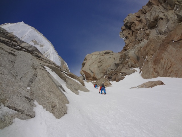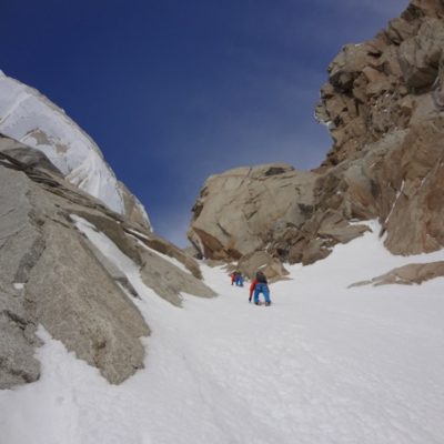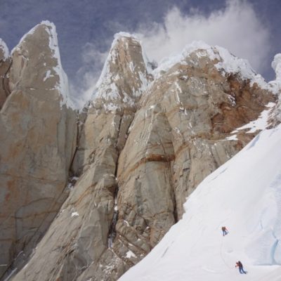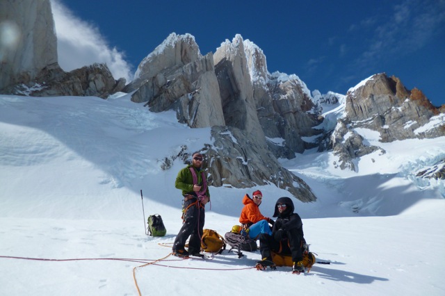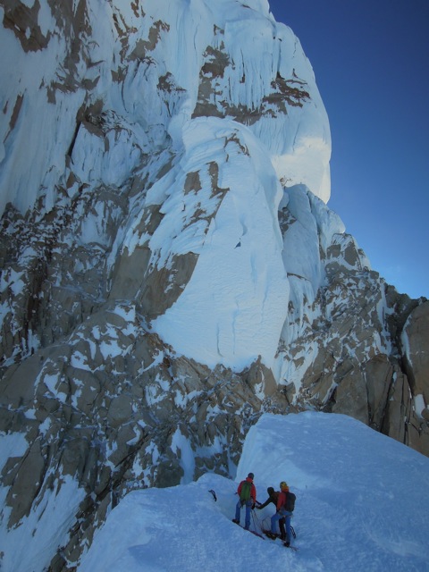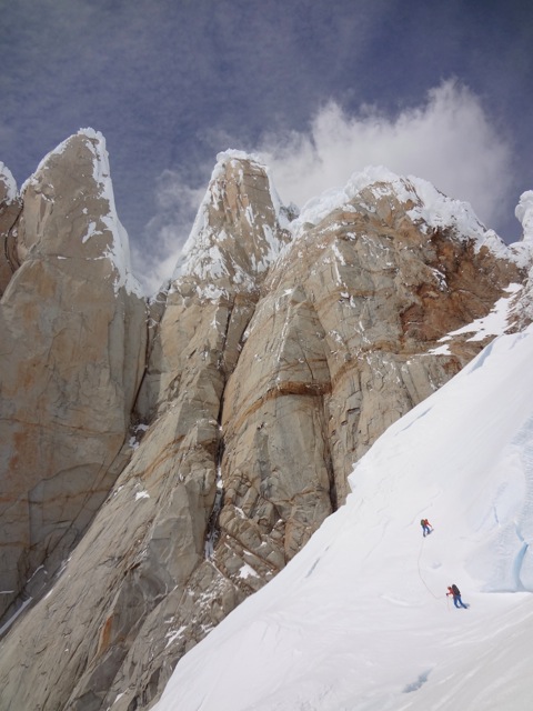 Nach 2 Wochen des wartens in El Chalten schien das Wetter endlich gut zu werden. Die Wetter- und Windprognosen waren vielversprechend. Da wir als erstes Team überhaupt in dieser Saison in El Chalten waren, gab es auch überhaupt keine Informationen zu den aktuellen Schneeverhältnissen. Das es für die Jahreszeit noch viel Schnee hatte war uns aber klar. So starteten wir am 10. November ins Torre Tal. Nach 6 Stündigem Anmarsch mit schweren Rucksäcken kamen wir im Niponino an wo wir auch die Nacht verbringen wollten. Am nächsten morgen starteten wir beim ersten Tageslicht in Richtung Col Standhardt. Vom ersten Meter weg mussten wir knietiefen Schnee spuren. Zum Glück waren wir zu viert! Nach etwa 4 Stunden erreichten wir den Col, seilten ein paar Seillängen ab und stiegen über den Gletscher zum runter zum Circo de los Altares. Danach gings in der Mittagshitze hoch zum Col Esperanza, da hiess es wieder spuren. Nach etwa 10 Stunden waren wir ziemlich kaputt an unserem zweiten Biwakplatz.