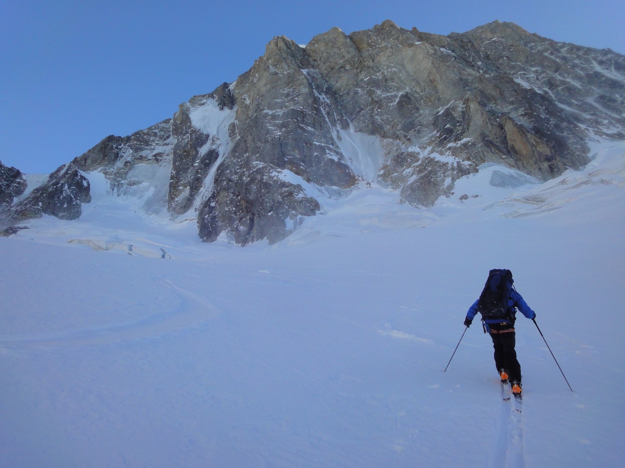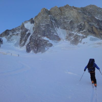 Wieder in den Bergen von Chamonix unterwegs, und wieder mit meinem Bergführerkollegen Dres Abegglen. Am Sonntag fuhren wir mittags zur Aiguille du Midi, dann per Ski durch das Vallee Blanche und hoch zum Wandfuss. Dort hatten wir einen ersten Einblick in die Wand. Eigentlich wollten wir die Colton-MacIntyre angehen, aber in der Schlüssellänge fehlte ein beträchtliches Stück Eis und das oberste Eisfeld sah sehr blank aus. So berieten wir uns und beschlossen in das ‘Leichentuch’ einzusteigen. Da wir keine Topos dabeihatten beschlossen wir, dass wir uns vor Ort für eine Ausstiegsvariante entscheiden würden.