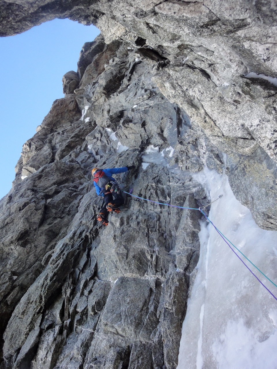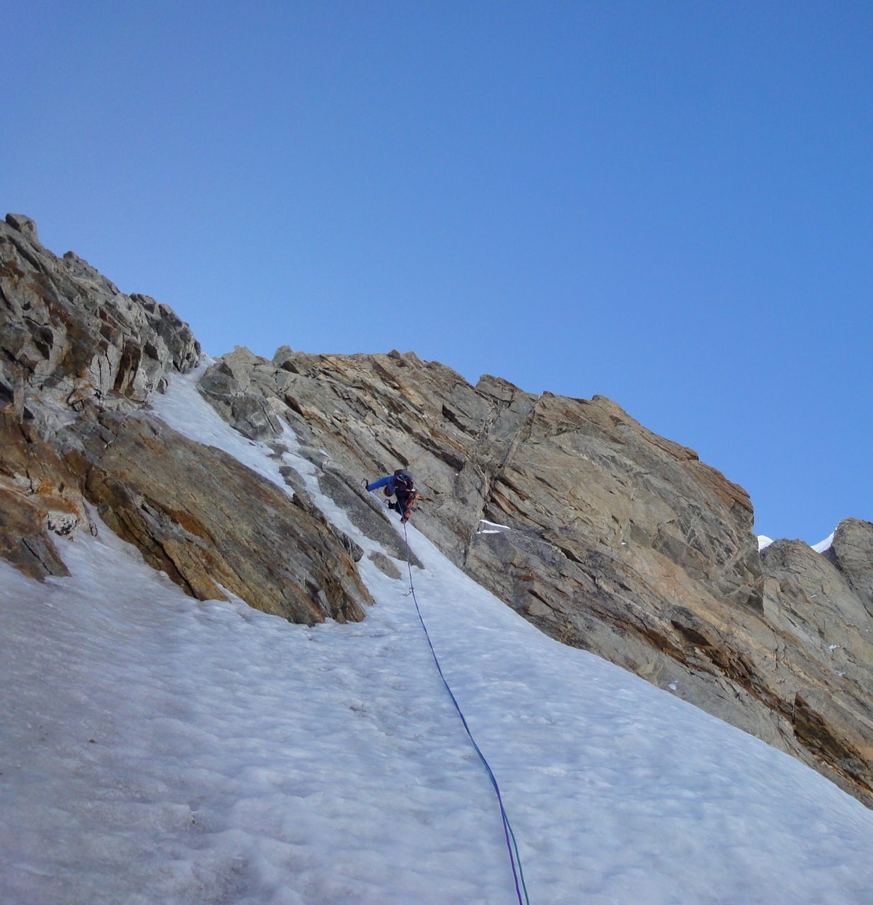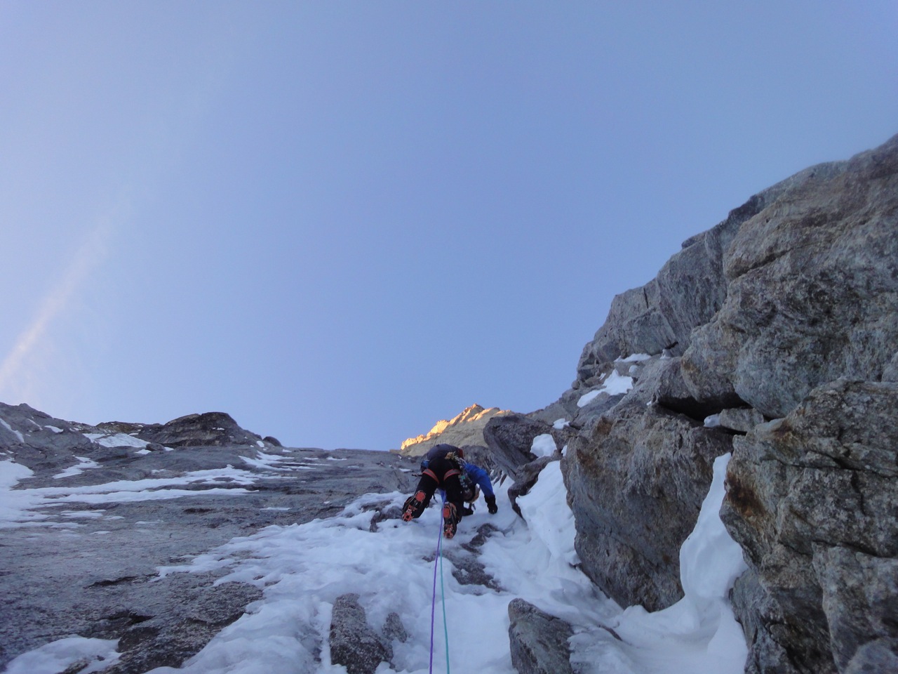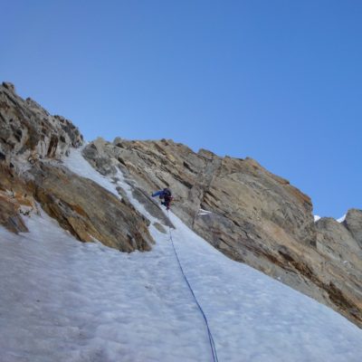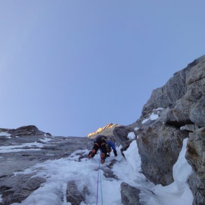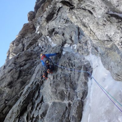 Am Montagmorgen starteten wir um 6.30 und stiegen ein. Die ersten 200m Meter boten moderate Mixedkletterei danach kam das (leider) zu harte Eisfeld. Nach dem Leichentuch beschlossen wir das mittlere Couloir hochzusteigen. Dort erwartete uns für 4 Seillängen interssante Mixedkletterei. Das letzte Eisfeld war steinhart und erforderte nochmals vollen Einsatz. Von dort ging es einfach über den Hirondellesgrat zur Pointe Walker. Um 15.30 standen wir auf dem Gipfel.