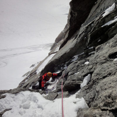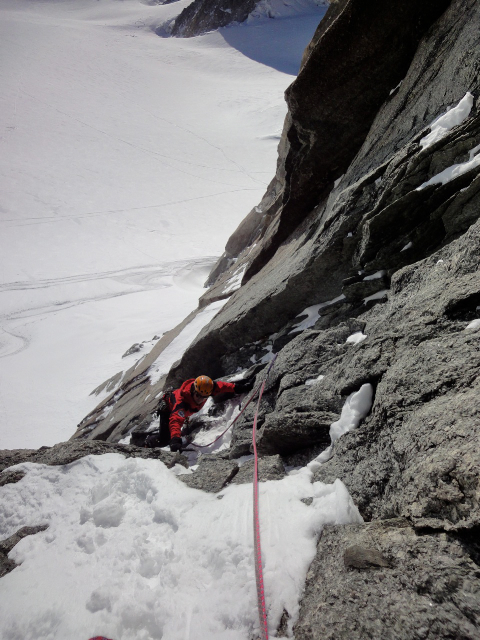Das Wetter war in den letzten Tagen bestens. Wieder einmal waren die üblichen Verdächtigen auf dem Weg nach Chamonix, mit der ersten Bahn zu Aigulle du Midi und mit den Skis zur Pointe Lachenal. Die 250m der ‘M6 Solar’ sollte es heute sein. Bei strahlendem Wettern hatten wir die Route dann auch zügig geklettert. Die Route bietet interessante Mixedkletterei bis M5+. Risse, Wandkletterei und Couloirs. Die Verhältnisse waren sehr trocken…