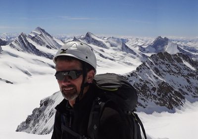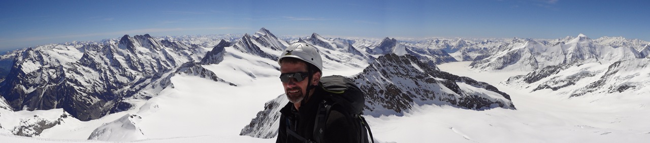 Am nächsten Morgen standen wir um 2.45 Uhr auf und starteten um 3.30. Den unteren Teil bis zum Mönchsplateau spurten zum Glück zwei Bergführerkollegen, die das Haston Couloir angingen und schliesslich auch kletterten. Beim Mönchsplateau kam das Tageslicht langsam hervor. Ab dieser Höhe sanken wir zum Glück nicht mehr so tief ein und kamen besser voran. Die Traversierung über das Gletscherplateau ging bestens. Die Spalten sind nicht sichtbar und gut eingeschneit. Die Traverse zur Schlüssellänge ist mit Schnee bedeckt und sehr gut begehbar. In der Schlüssellänge war ein wenig Schnee, was aber nicht weiter störte. Oberhalb vom Schulterstand war bester Trittschnee, so dass wir rechts von der Felsrippe aufsteigen konnten. Nach gut sieben Stunden standen wir auf dem Gipfel. Der Abstieg war schnell hinter uns gebracht und der Saisonstart ging mit einer tollen Tour zu Ende…