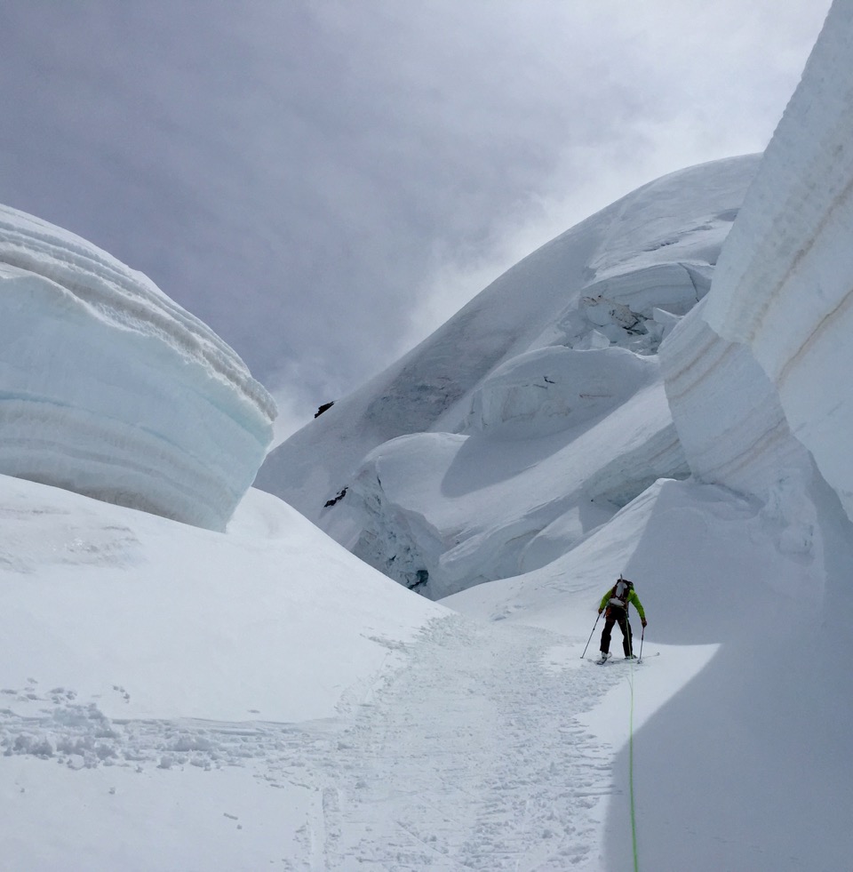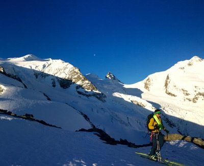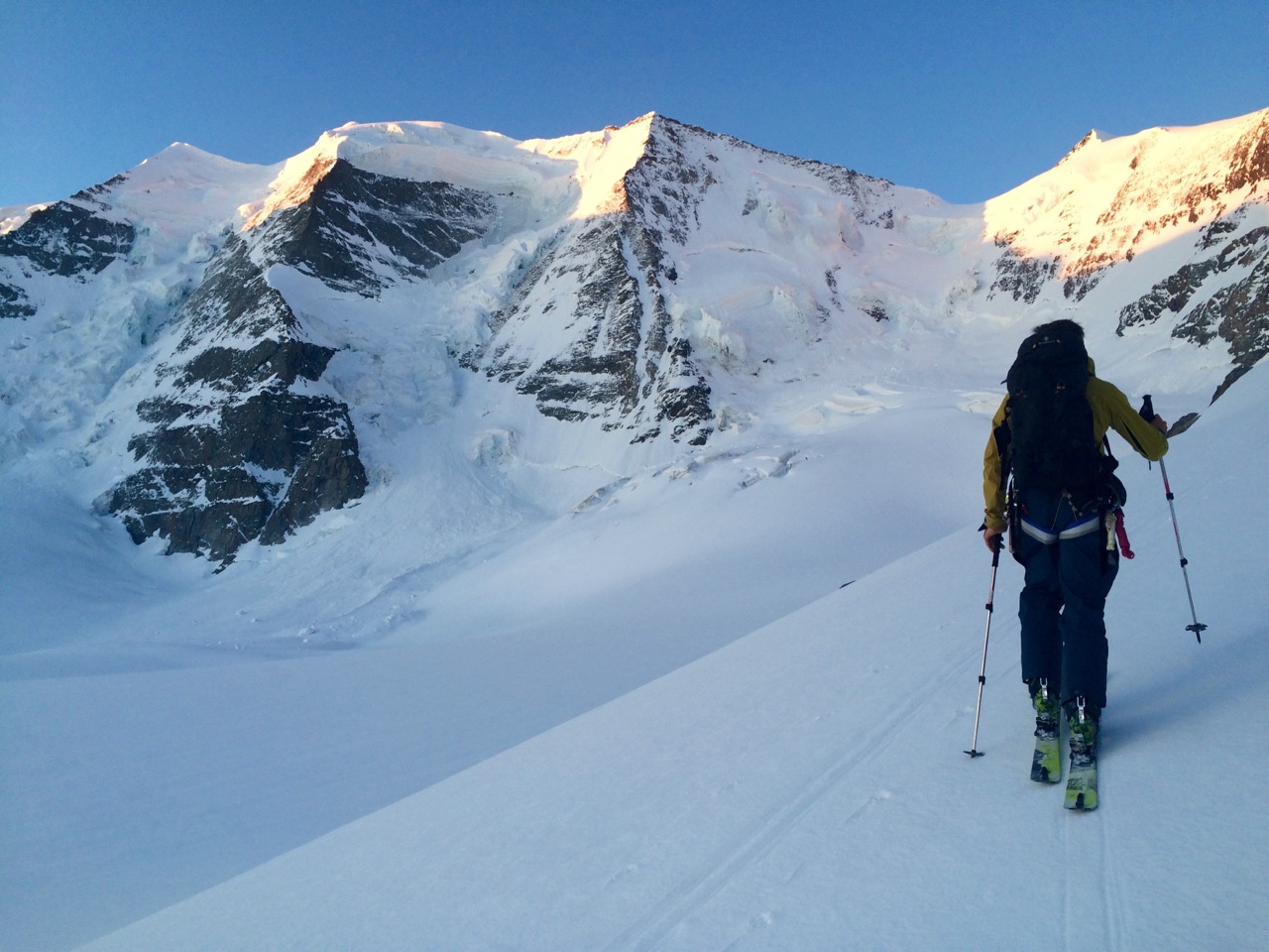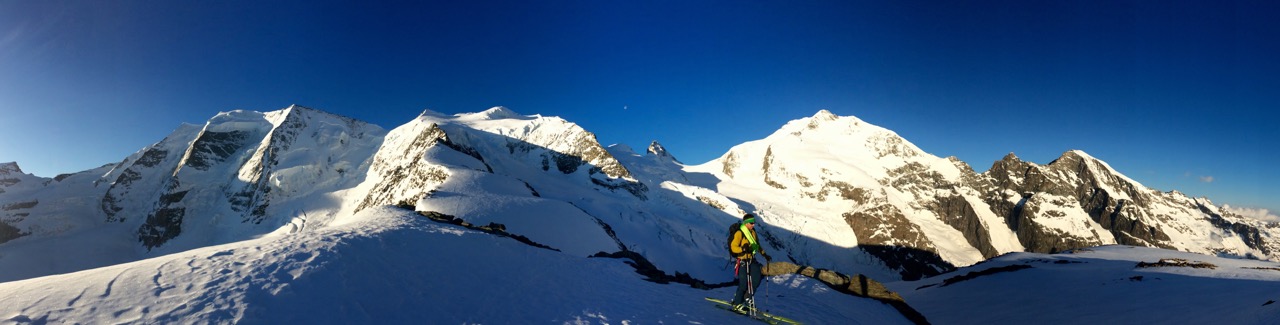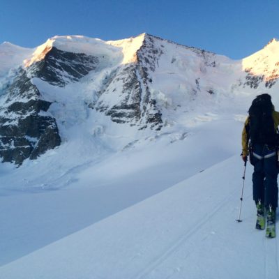 Am Freitagmorgen stiegen wir bei Mondschein über die Fortezza in Richtung Palü. Die Verhältnisse waren bestens. Die anschliessende Traversierung ging auch recht schnell und so standen wir um 11Uhr auf dem Hauptgipfel des Piz Palü. Noch immer war im ganzen Gebiet keine Menschenseele zu sehen. Die Abfahrt zurück in Richtung Diavolezza bot oben ein wenig Pulverschnee und in der unteren Hälfte beste Sulzverhältnisse. Was will man mehr auf einer Frühlingsskitour!