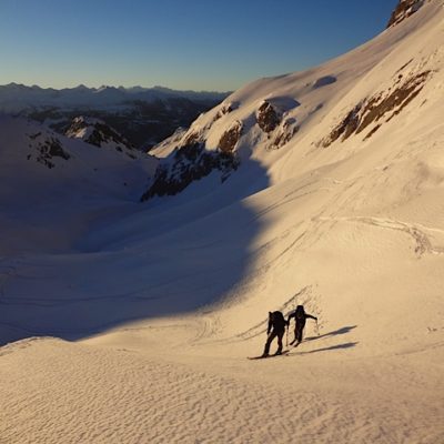 Am nächsten Morgen gings um 6.45 Uhr los in Richtung Gipfel. Die Temperatur war angenehm, kurz vor dem Skidepot sogar heiss! Beim Skidepot angekommen, beschlossen Cla und Martin die Skier mitzunehmen. Die Anderen wollten das Couloir hoch- und auch wieder Absteigen. Die Spur war gut und so standen wir schon bald vor der Schlüsselstell, dem Gipfelaufschwung. Der Gipfelturm bietet ausgesetzte Kletterei im dritten Schwierigkeitsgrad. Die Stahlkabel helfen aber. Nach kurzer Gipfelrast seilten wir wieder ab (15m) und stiegen zum Couloir runter. Cla und Martin fuhren nun das 40 Grad Couloir runter und warteten beim Skidepot auf uns. Nun folgte eine geniale Abfahrt in schönstem Skigelände. Trotz dem Warmen Wetter hatten wir noch Pulverschnee vom Gipfel bis fast ins Tal, speziell das ‘Treeskiing’ unterhalb der Hütte war ein Riesenspass. Vielen Dank an Thomas, Martin, Cla und Roland die super Skitage!